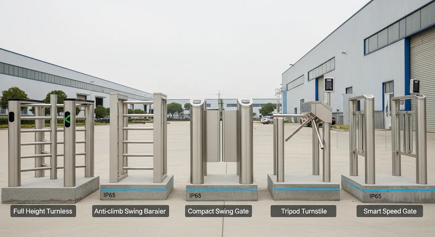 Un: Les principaux types de portails homologués pour l’extérieur sont: Tourniquet pleine hauteur (les plus courants pour les périmètres à haute sécurité); Porte de barrière oscillante anti-montée (Périmètres extérieurs à sécurité moyenne); Porte pivotant compacte (Postes extérieurs limités en espace); Tourniquet trépied extérieur (Portes d’entrée des usines et de l’industrie); Portail de vitesse intelligent extérieur (Vestibules d’entrée couverts); et portail coulissant en verre (Entrées extérieures couvertes premium). Les modèles à pleine hauteur et trépied sont le plus souvent déployés en position extérieure entièrement exposée; Les modèles de porte de vitesse et de porte coulissante nécessitent généralement un auvent permanent.