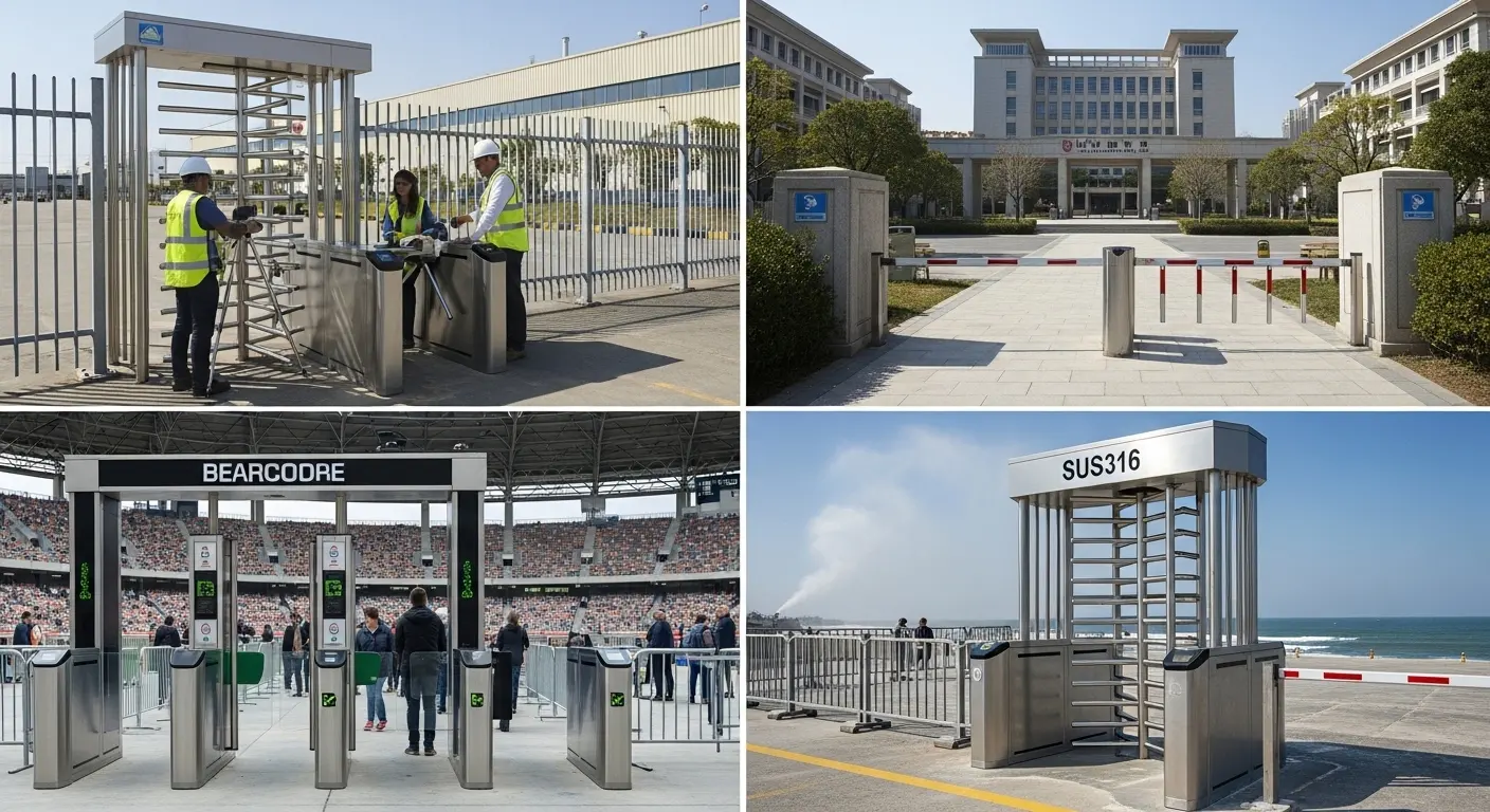 L’environnement de portail de tourniquet extérieur le plus exigeant. Le chlorure d’air salin attaque le SUS304 aux joints de soudure et aux points de fixation dans les 2 à 5 ans. Sur ces sites, La construction du SUS316 remplace le SUS304 comme référence — aux côtés de l’étanchéité électronique IP65, Ensembles de roulements scellés, et traitement de passivation de tous les points de soudure extérieurs.