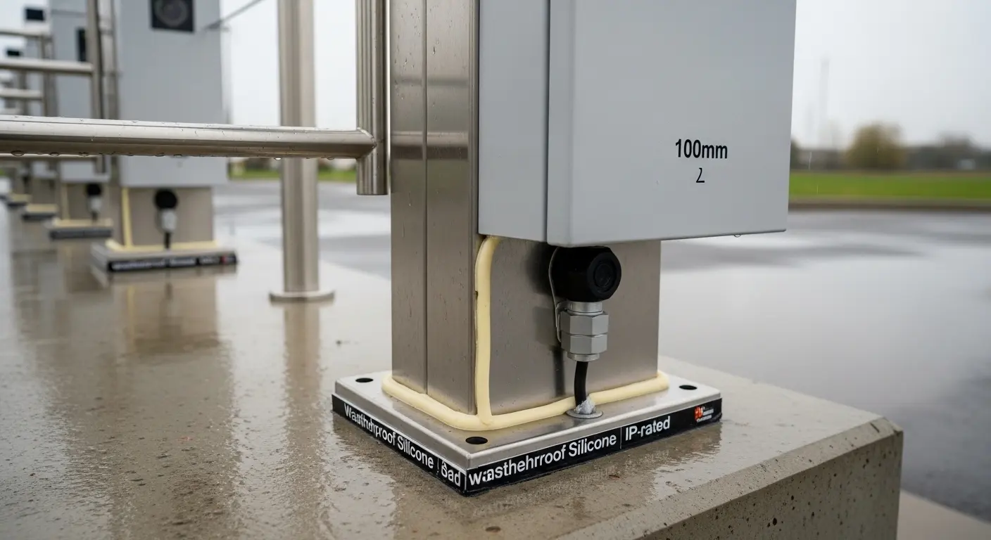 Scellez tout le périmètre de la bride de la base de l’armoire au socle en béton avec du silicone imperméable — les quatre côtés, Appliqué en continu. Tout espace permet la réabsorption de l’eau sous l’action capillaire, contourner complètement le sceau IP par en dessous.